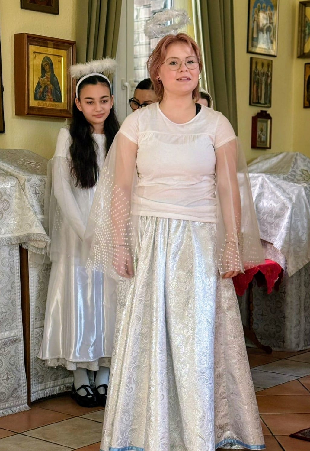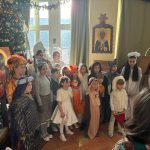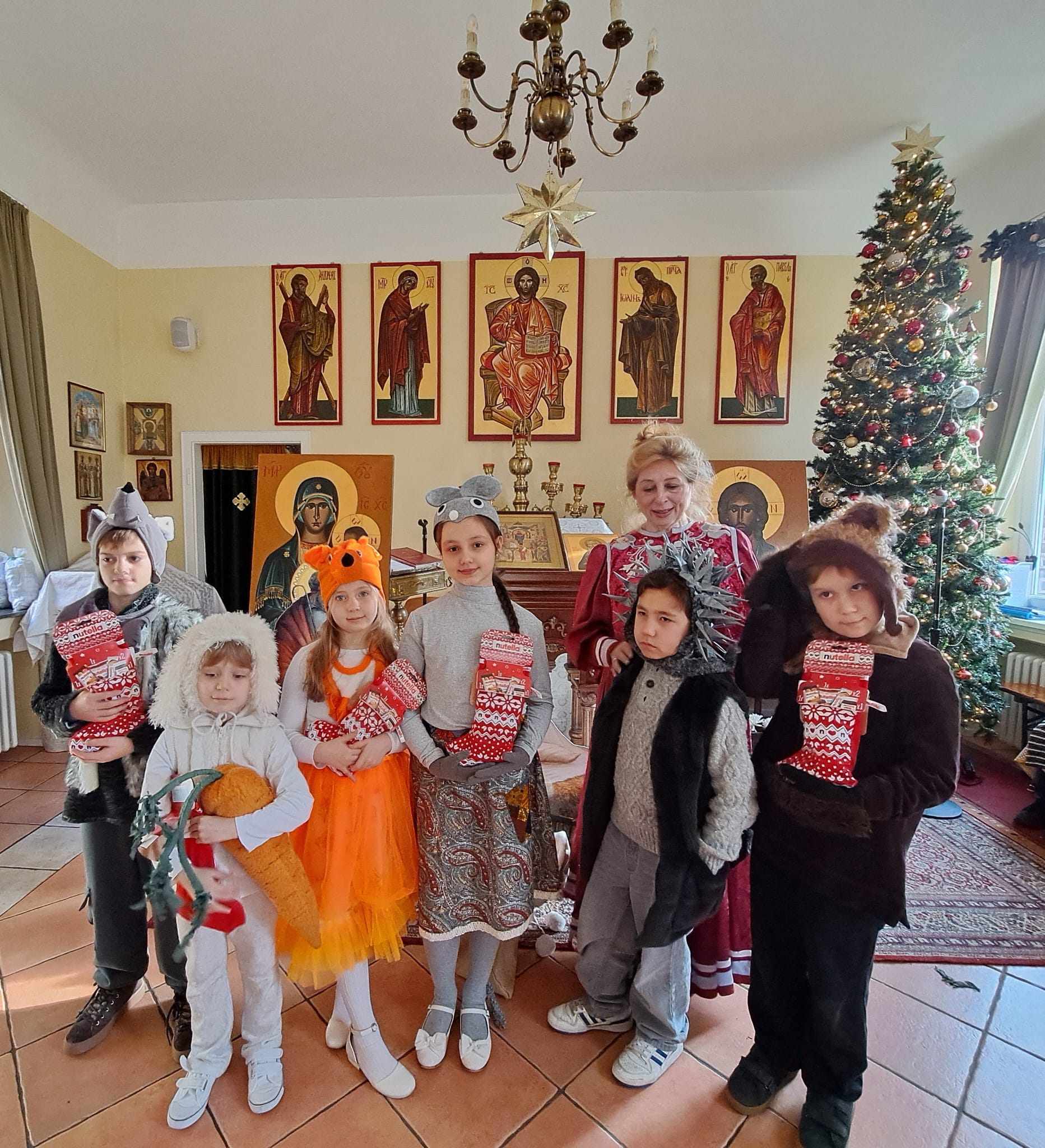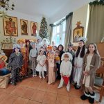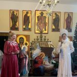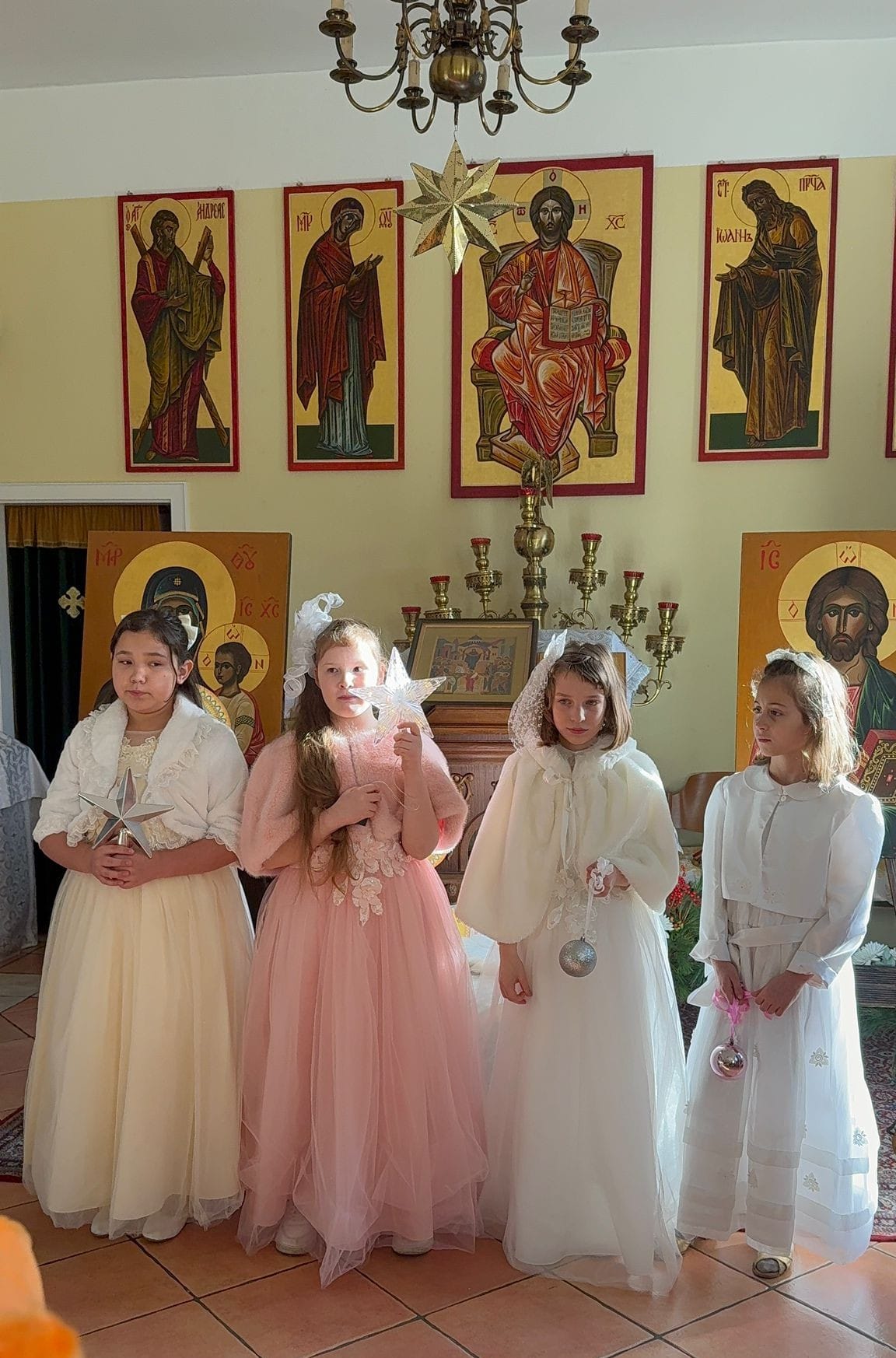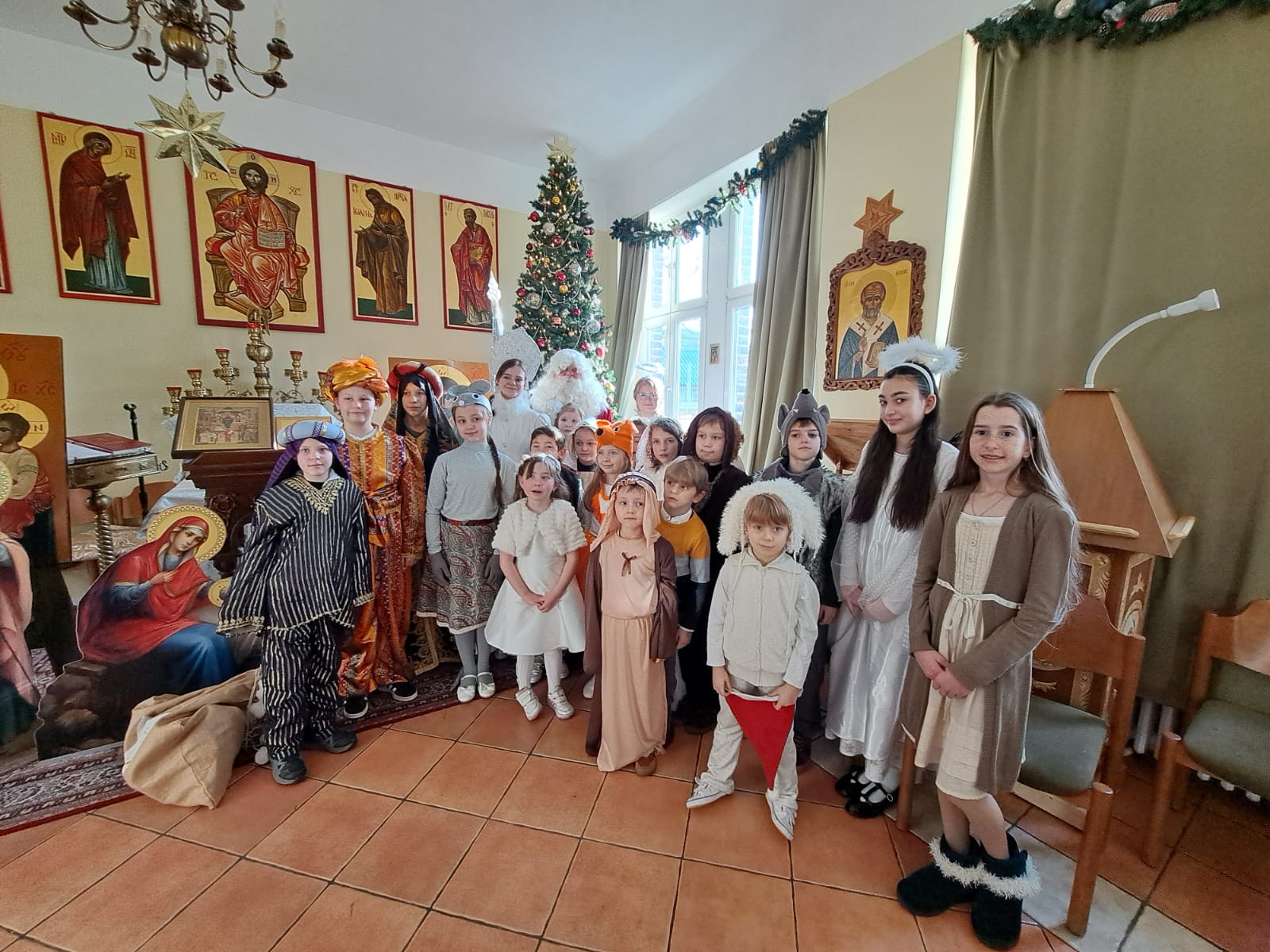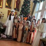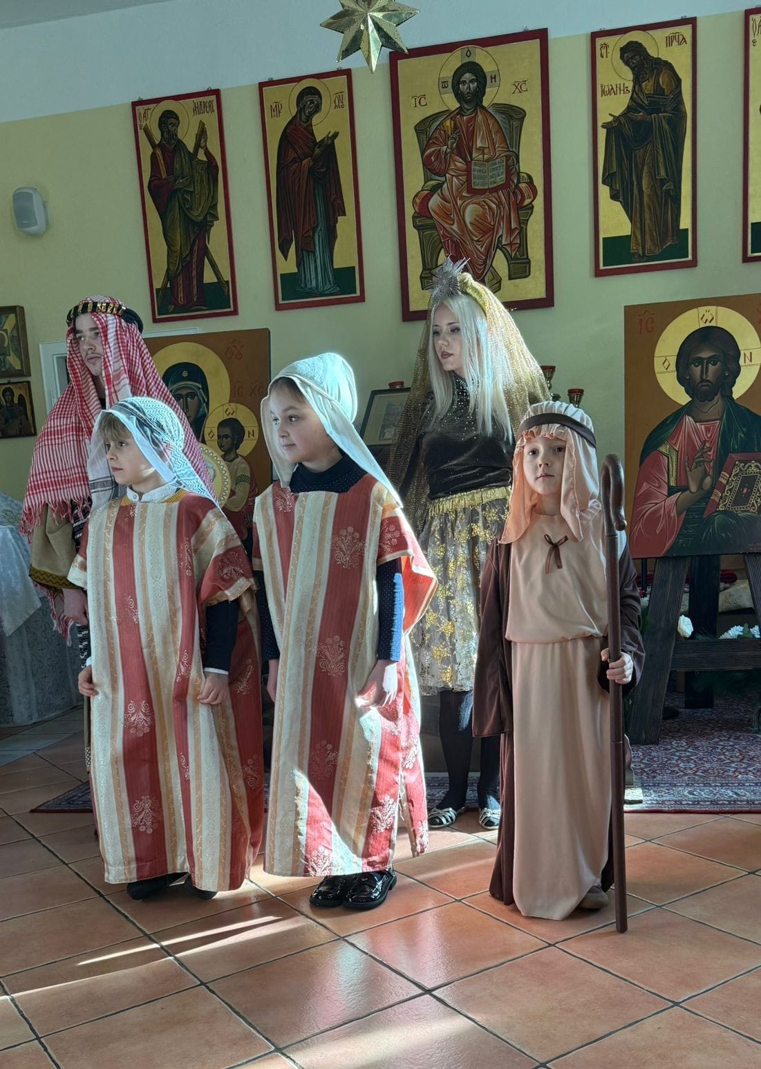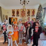 Эту часть спектакля подготовили yченики младшей группы и роли свои они выучили в стихах! В завершение они все вместе спели колядку “Рождество Христово, Ангел прилетел” и отправились в гости к детям.